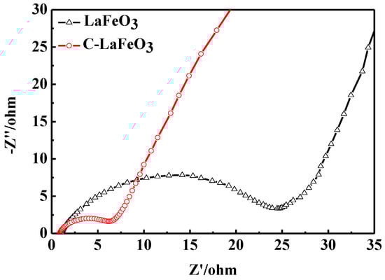 The EIS spectra of the LaFeO3 and C-LaFeO3 samples are shown in Figure 9. As can be seen from the figure, the EIS lines are composed of semicircles in the high frequency region and oblique lines in the low frequency region. Compared to LaFeO3, the EIS of the C-LaFeO3 sample possesses a reduced semicircle diameter and an increased linear slope. These results indicate that the charge transfer resistance and ion diffusion resistance of the C-LaFeO3 sample are reduced, and the electrochemical performance is improved. This improvement is primarily due to the good conductivity of the carbon material. The combination of C with LaFeO3 accelerates ion diffusion and the migration rate on the electrode surface and reduces the composite impedance of the C-LaFeO3 sample.