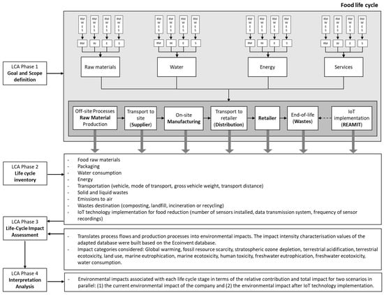 Life cycle assessment (LCA) is a methodology that can analyse the environmental impacts of products or processes by inventorying all the inputs and outputs throughout the product’s life cycle, from raw material production to end-of-life [23,24,25]. This methodology determines where the most significant impacts occur and where the most relevant improvements can be made while identifying potential trade-offs [26,27]. It allows companies to investigate areas where they might improve [28,29]. Although some LCA tools exist for other sectors [30,31,32], there is no generalised LCA tool for understanding the environmental impacts of different stages of the food supply chain or implementing IoT technologies to save food waste. Such a tool will be invaluable given the increasing trend in the food industry for using new technologies. This paper fills this gap and contributes to the literature.