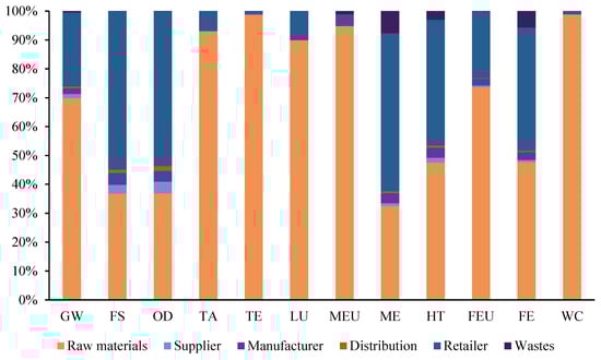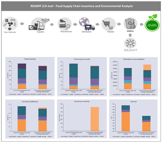 Having filled the inventory of relevant processes in the previous sections, the user can view the environmental results on the LCA results worksheet by clicking the “Next” button available in the top right corner of the tool. The charts built in this worksheet show the environmental impacts associated with each life cycle stage (raw materials, supplier, manufacturing, distribution, retail, wastes) for two scenarios in parallel: (1) the current environmental impact of the company and (2) the environmental impact after IoT technology implementation (REAMIT strategy). Results are shown for the 12 impact categories in terms of the relative contribution of each stage of the supply chain (Figure 3), while a table shows the absolute values of each impact category results per stage.