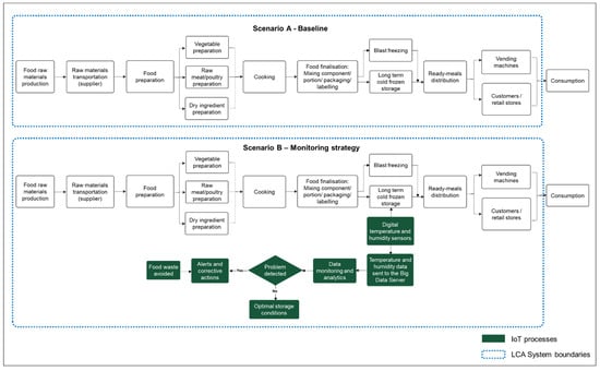 The system boundaries are illustrated in Figure 4 and follow a cradle-to-grave approach. The processes include raw materials acquisition from the supplier and transportation to the factory, manufacturing (vegetable, meat, poultry and dry ingredients preparation, cooking, finish goods and storage), distribution, retail and solid wastes treatment. Scenario B also comprises digital sensors for measuring the specific parameters, the Big Data server and the food waste avoided. Both scenarios exclude food raw materials production and consumption.