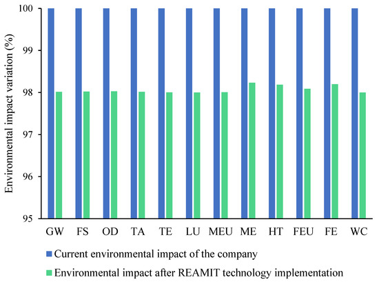 Figure 7 presents the total impact obtained for the first sensitivity analysis, i.e., the influence of the monitoring IoT technologies on the environmental impacts considering a 2% reduction in food waste generation.