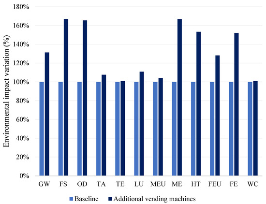 However, caution must be taken when affirming the positive effect of IoT technologies in reducing food systems’ environmental impacts, as this can be a single case. Implementing IoT technologies in any system causes resource use, and if food waste reduction is not considered, the total impact of the organisation tends to increase. Furthermore, even considering the reduction, the overall balance of impacts depends on the amount of food avoided. The second sensitivity analysis in Figure 8 shows the influence of increasing the number of vending machines in the retail stage.
