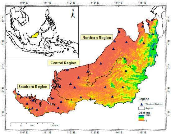 Sarawak is the largest state in Malaysia in terms of land area (Figure 1). It has an area of 124,450 km2 and is located immediately north of the Equator between latitudes 0°50′ and 5° N and longitudes 109°36′ and 115°40′ E, as shown in Figure 1. Sarawak has an equatorial climate and weather. For most of the year, the temperature remains relatively consistent, ranging from 23 °C early in the morning to 32 °C during the day. The temperature in highland areas such as Bario varies between 16 °C and 25 °C during the day, and it can be as low as 11 °C at night. Sarawak also experiences two monsoon seasons. The northeast monsoon (NE), which occurs from November to March, is known for its heavy rainfall, whereas the southwest monsoon (SW), which occurs between May and September, is usually milder. In addition, there are two short inter-monsoon (INT) seasons in April (Int-April) and October (Int-Oct). The NE monsoon is the wettest season, defined by easterly or northeasterly winds of 10–20 knots, whereas the SW monsoon is comparatively dry, marked by light southwesterly winds (below 15 knots) [7,8,9,10,11,12]. During the active monsoon months, the NE monsoon is more noticeable because of the sudden increase in rainfall. The SW monsoon, on the other hand, is linked to a relatively dry time [22,23].