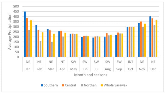 Average precipitation during the different monsoon seasons (NE: northeast, INT: inter-monsoon, SW: southwest) for 33 meteorological stations in the study area based on the southern, central, northern, and whole regions of Sarawak.