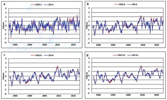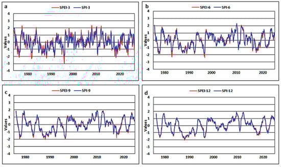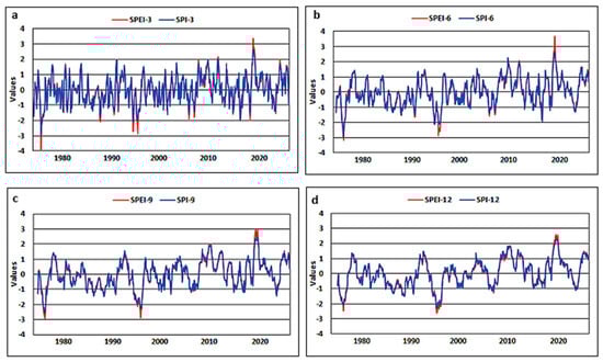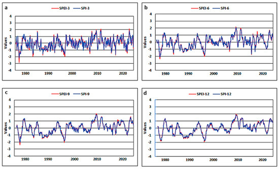 The values of the SPI and SPEI for the whole region on different timescales (a) 3-month, (b) 6-month, (c) 9-month, (d) 12-month.