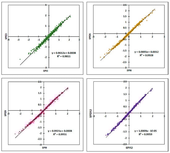 Figure 8 shows Pearson’s correlation coefficient between the SPI and SPEI over different amounts of time. For 6-, 9-, and 12-month timescales, there was a linearly significant Pearson’s correlation coefficient between the SPI and SPEI (r = 0.99 at p < 0.0001), but for a 3-month timescale, the correlation was r = 0.99 at p < 0.0001. Both the SPI and the SPEI demonstrated an upward trend, and there was a significant connection between the two indices. Some researchers [33] also discovered that the SPEI shows excellent capability in detecting extreme drought in Sabah. The finding is in good agreement with what Uddin et al. [31] found in the western, eastern, and central regions of Bangladesh. Other researchers found that the first- and second-best drought monitoring indices in South Africa were the SPI and the EDI (Effective Drought Index), which contradicts this study [34]. On the other hand, they showed that the EDI is better than the SPI for tracking both long-term and short-term droughts in the semi-arid river basin in India [16]. This difference could be caused by the flat, low-lying terrain of our study area, which makes it possible for oceanic and atmospheric circulation patterns to be different.