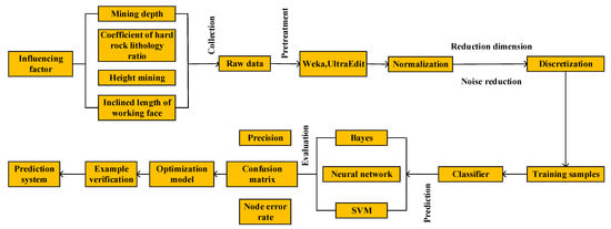 In order to realize the accurate prediction of the height of the water flowing fractured zne [31,32,33], the prediction process is constructed, as shown in Figure 1.