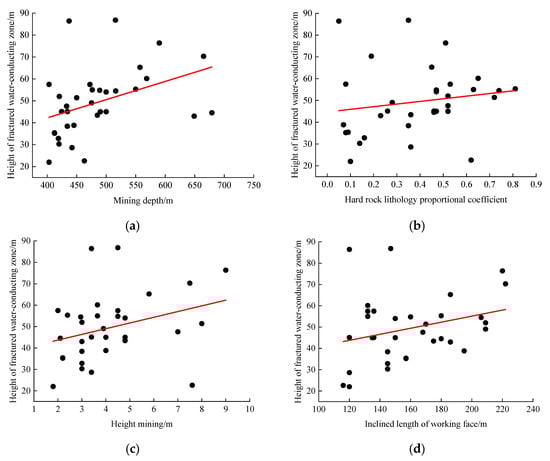 In order to determine the relationship between the influencing factors and the height of the water flowing fractured zone, each scatter plot was established for research [35,36,37,38,39]. It can be seen from Figure 2 that there is a certain linear relationship between the mining depth (Figure 2a), the coefficient of hard rock lithology ratio (Figure 2b), the height mining (Figure 2c) and the inclined length of working face (Figure 2d) and the height of the water flowing fractured zone (y), as shown below: