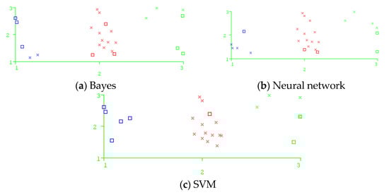 The confusion matrix is a special matrix used to show the performance of the algorithm. The larger the diagonal value of the confusion matrix, the more examples of classification. The confusion matrix results of the three models are shown in Table 4. Visualize Classifier errors, in which the instances of correct classification are represented by crosses, and the instances of wrong classification are represented by blocks. Blue indicates a low forecast grade, red indicates a medium forecast grade, green indicates a high forecast grade, The error scatter plots of the three models are shown in Figure 3.