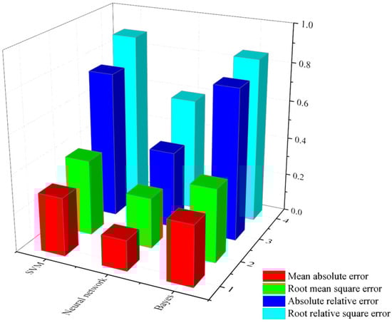 It can be seen from Figure 4 that the Naive Bayesian model is slightly larger than the support vector machine in the mean absolute error and the absolute relative error. In terms of root mean square error and root relative square error, support vector machine is slightly larger than Naive Bayesian; the value of the node error rate of the two models is not much different. However, it is clear from the diagram that the value of the artificial neural network model is the lowest in the node error rate, and the training effect is the best.