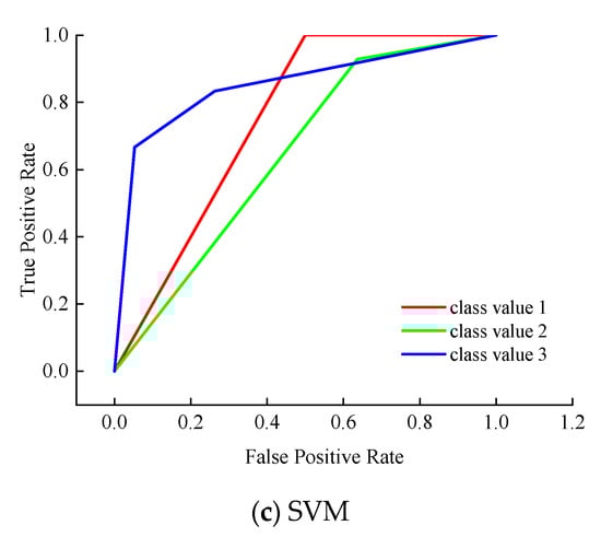 ROC Area (receiver operating characteristic curve area): Display the ROC area, the decimal range of [0, 1]. The ROC area is generally greater than 0.5, and the closer to 1, the better the classification effect of the model. When the value is between 0.5 and 0.7, the accuracy is low. When the value is between 0.7 and 0.9, it shows a certain accuracy. When the value is greater than 0.9, it shows a higher accuracy. The ROC values of the three models are shown in Table 6, and the ROC curves of the three models are shown in Figure 5.