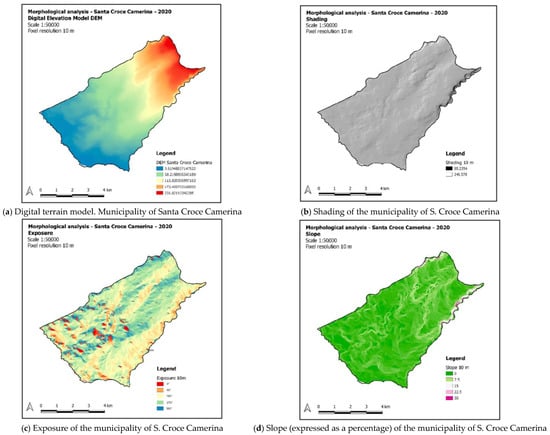 The morphological analysis of the terrain carried out by using the QGIS software, on the basis of the contours and the elevation points, produced a digital model of the terrain-DTM (Figure 4a) with a 10-m pixel resolution. Based on the obtained DTM, other QGIS tools allowed for a calculation of the shading (Figure 4b), the exposure (Figure 4c), and the slope (Figure 4d) expressed in percentages.