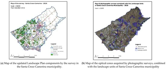 Maps produced in Phase 3 and 4 of the methodology: (a) map of the updated landscape plan components by the in the Santa Croce Camerina municipality; (b) map of the optical cones acquired by photographic surveys, combined with the landscape units of Santa Croce Camerina municipality.
