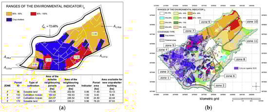 (a) The map of the suitability of the parcels to be converted into areas for protected cultivation of the municipality of S. Croce Camerina; (b) map of the I6 indicator for the municipality of S. Croce Camerina. Adapted with permission from Ref. []. 2010, IAgrE.