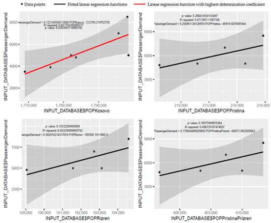 Based on the results of the performed partial linear correlation and regression analysis between 33 potential statistical indicators extracted from available big data systems and the dependent variable representing passenger demand on the Prizren–Zagreb bus route, 20 (60.6%) potential predictor variables were eliminated from the input dataset, either due to weak linear correlation strength, i.e., a low Pearson coefficient (r) and/or due to the low level of statistical significance of the obtained linear regression functions (p-values). The thresholds used to decide whether to retain or eliminate each of the statistical variables considered from the input data set were 0.60 and 0.05 for the coefficient of determination (r2) and the p-value, respectively. All predictor variables that did not meet these conditions were considered nonlinearly correlated and unsuitable for the development of a linear multiple regression model and were therefore removed from the input data set. The results of the partial correlation and regression analysis are presented both in tabular form and in the form of comparative scatter plots. The coefficient of determination values and p-values obtained for each potential predictor variable were grouped into 11 statistical groups according to the type of statistical indicators (transportation, spatial, demographic and socioeconomic indicators) and stored in separate data vectors. Finally, in order to select the most significant predictor within each of the defined statistical groups, the created data vectors containing r2 and p values were analysed to identify statistical indicators with the highest coefficient of determination and the lowest p-value. Based on this procedure, the five most significant potential predictors were selected for further steps of statistical analysis. Examples of comparative scatter plots with fitted linear regression functions between selected predictor variables and dependent variables are shown in Figure 1.