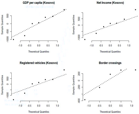 The residuals of the remaining four potential predictor variables were also tested for multivariate normality by performing the Shapiro–Wilk normality test. The results of the Shapiro–Wilk statistics show that all tested variables can be considered normally distributed (Table 6). The results of the normality test, visualized in the form of comparative quantile–quantile plots are shown on Figure 2.