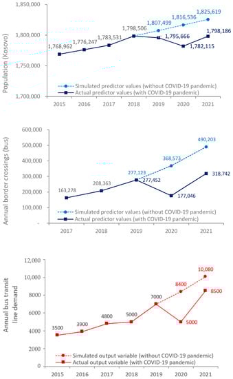 Therefore, it can be assumed that the most probable cause of this anomaly is that the COVID pandemic that occurred in the same period. Based on this reasoning, we concluded that a logically correct formulation of the multiple regression model can be obtained by replacing the actual values of the two considered predictor variables and of the bus passenger demand output variable, recorded during the COVID pandemic, with corresponding simulated values that would be expected for these variables without the occurrence of COVID pandemic in this period. The corresponding simulated values in the critical period were obtained by using the representative annual growth rates for the considered predictors and the output variable, which were determined based on the trend analysis of historical values of predictors and the output variable, recorded in the period between the years 2015 and 2018.