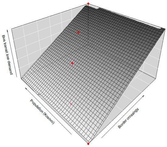 To obtain a new mathematical formulation of the multiple regression model, the simulated values of the observed predictors and output variable were first imported into the Rstudio environment and stored in three data vectors named “PopKosovoSimulated”, “Border-BusSimulated” and “PassengerDemandSimulated”. Finally, the new forecasting model was created by calling the lm() function with a new set of input and output parameters. The detailed output performances of the multiple linear regression model obtained based on the simulated values of the considered predictors and the output variables are shown in Table 9. The two-parameter regression function of the obtained multiple linear regression prediction model, visualized in the form of a three-dimensional regression plane is presented on Figure 4.