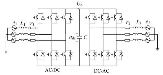 Firstly, we set up the back-to-back cascading converter topology as shown in Figure 1. The converter on both terminals is composed of three pairs of switch tubes in a three-phase bridge circuit. is the grid voltage at the rectifier end, and are the filter inductance and parasitic resistance of the rectifier converter, respectively, is DC filter capacitor, and are DC voltage and current, respectively, and are the filter inductance and parasitic resistance of the inverter converter, respectively, and is the grid-connected voltage of the inverter.