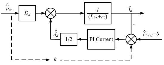 The DC terminal voltage error is used as a given compensation for the inverter d-axis power loop, and the improved inverter transfer function block diagram is shown in Figure 5. The transfer function of inverter DC terminal voltage to d-axis current can be directly derived from Figure 5, as shown in Equation (19):