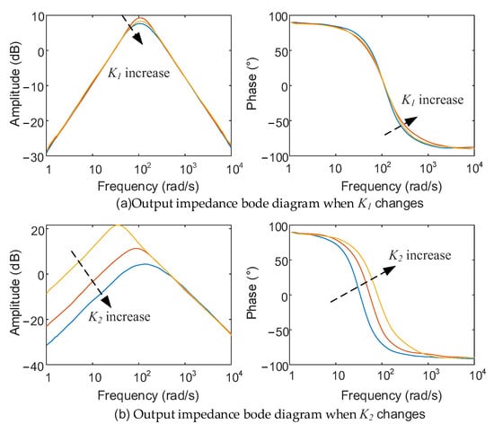 Output impedance bode diagram when coefficients K1 and K2 change. (a) Output impedance bode with K1 changes. (b) Output impedance bode with K2 changes.
