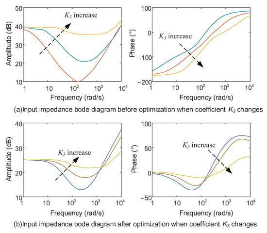 When the feedforward voltage is introduced into the power loop of the inverter, only the input impedance of the inverter is affected, and it has nothing to do with the rectifier side. Therefore, the change in the input impedance of the optimized inverter is analyzed. Figure 8 shows the input impedance bode diagram before and after optimization when the coefficient K3 changes.
