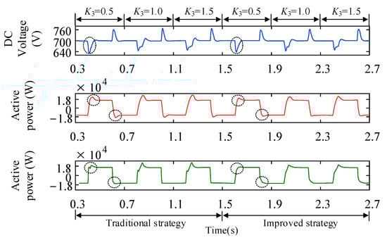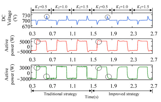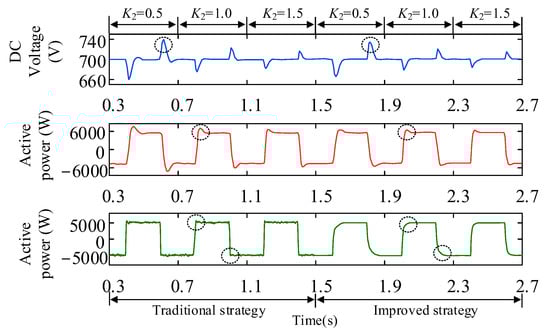 For the above theoretical analysis, this paper built a three-phase back-to-back converter cascade system on the MATLAB/SIMULINK simulation platform. Table 1 shows the main circuit parameters in the simulation, and Table 2 shows the PI parameters of each control link. In accordance with the theoretical analysis, the rectifier adopts the DC voltage and filter inductor current double closed-loop control strategy, while the inverter adopts the constant power control mode. Figure 11, Figure 12 and Figure 13, respectively, show the changes in DC terminal voltage, rectifier, and inverter power of the cascade system before and after optimization when the coefficients K1-K3 change. Figure 14 shows the changes in DC terminal voltage, rectifier, and inverter power when output power changes.