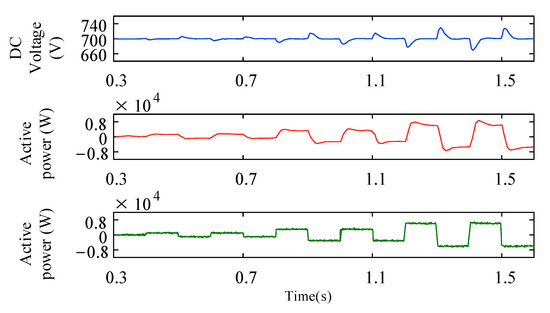 Figure 14 shows the DC terminal voltage, rectifier, and inverter power output of the improved converter when output power P is 1 kW, 3 kW, and 7 kW, respectively. As the power increases, the voltage spike generated by the DC terminal voltage at the power mutation increases. The power variation of the rectifier and inverter gradually becomes uneven, and the stability of the converter system becomes worse.