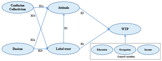 Further, it is necessary to introduce trust as a variable by which to explore the influence of traditional cultural values on Green food purchasing, as people from different national cultures differ in their willingness to trust [32]. Trust is divided into interpersonal trust and institution-based trust [33]. Baniamin et al. (2020) propose that individuals who are more affected by traditional cultural values have higher levels of institutional trust [34]. For Chinese people influenced by Confucian collectivism, trust always coincides with “guanxi” which facilitate mutual trust [35]. The relationship between individuals and authority follows a “hierarchical” authoritarianism tendency; those individuals hold political authority in awe [36]. In other words, Confucian collectivism values improving the level of institution-based trust, especially for the absolute body of authority—the government with great power [37]. It is supposed that Chinese consumers who are more influenced by the values of Confucian collectivism believe more that the Green food label certified by the government is trustworthy. Therefore, it is hypothesized that: