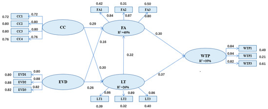 The SEM results show that χ2 = 144.485 (p < 0.01), df = 96, GFI = 0.957, AGFI = 0.939, NFI = 0.965, CFI = 0.988, IFI = 0.988, RMSEA = 0.035, and RMR = 0.059. The χ2 of 114.485 with 96 degrees of freedom showed a 1.505:1 chi-square to degrees of freedom ratio, which satisfies the recommended ratio of below 3:1. All fitting indicators meet the ideal indices. Further, the variance of constructs explained by antecedents are evaluated. All antecedents of attitude explained 39.9% of variance in FA. In addition, CC and EVD explained 25.7% of variance in LT; FA and LT explained 34.5% of variance in WTP (Figure 2).