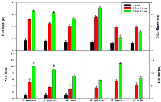 The amendment of the FA dumpsite with the combined application of FYM and pressmud significantly enhanced the plant growth parameters of the selected bamboo species (Figure 2). Among the three bamboo species, B. balcooa showed maximum improvement in growth in terms of height (328.65%), diameter (408.63%), culms (900%), and litter (1328%). This was followed by B. bambos with improvements in height (326.62%), diameter (77.86%), culms (800%), and litter (2664%) whereas B. tulda showed height (318.59%), diameter (62.17%), culms (600%), and litter (1532%).