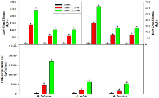 In addition to phytoremediation, this work evaluated the influence of FYM and pressmud on the plant biomass of three bamboo species viz.: B. balcooa, B. bambos, and B. tulda (Figure 3). The combined application of organic waste amendment significantly improved the AGB and BGB of bamboo species. This improvement in plant biomass occurred due to the increased availability of NPK through organic amendment [43]. Morover, the enrichment in organic carbon through organic waste amendment improved the beneficial plant rhizosphere microbiota and, consequently, the plant biomass [44]. Most importantly, the carbon sequestration rate (CSR) of all the selected bamboo species was improved remarkably with the amendment of FYM and pressmsud (Figure 3). In correspondence with our results, [45] also reported that the addition of FYM significantly enhanced the carbon sequestration rate of rice and wheat.