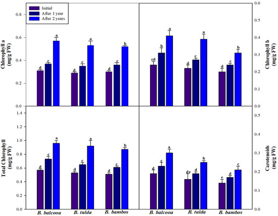 The photosynthetic pigments of all three bamboo species B. balcooa, B. bambos, and B. tulda were evaluated during plantation and after two years of plantation (Figure 5). Results showed that B. balcooa had the highest improvements in Chl-a (96.77%), Chl-b (80.95%), total chlorophyll (90.38%), and carotenoid content (47.36). This was followed by B. bambos with improvements in Chl-a (96.55%), Chl-b, (105.82%), total chlorophyll (100%), and carotenoids (57.14%). The least improvements were observed in B. tulda with Chla-a (76.66%), Chl-b (78.94%), total Chl (77.55%), and carotenoids (31.25%). This signifies that B. balcooa showed the highest improvement in photosynthetic pigments after amendment with a combined dose of FYM and pressmud.