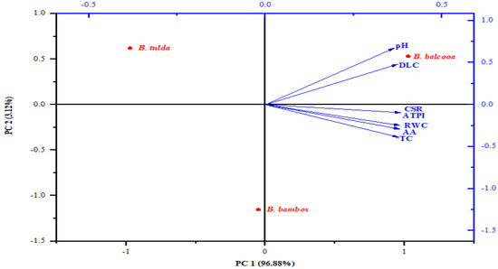 After two years of plantation, all three species of bamboo were analyzed for their APTI capacity (Table 4). The results demonstrated that B. balcooa has the maximum APTI components in terms of ascorbic acid (8.12 ±0.79), pH (7.33 ± 0.12), RWC (77.59 ± 2.51), and, consequently, the APTI (13.7). Its dust load capacity (0.91 ± 0.02) was also the maximum compared to the other bamboo species. Likewise, for B. bambos, the values were ascorbic acid (7.37 ± 0.36), pH (6.2 ± 0.1), RWC (74.07 ± 6.42), APTI (12.66), and dust load capacity (0.47 ± 0.01) while as B. tulda showed the least values with ascorbic acid (4.95 ± 0.09), pH (5.97 ± 0.06), RWC (67.02 ± 7.65), APTI (10.09) and dust retention capacity (0.32 ± 0.01). Principal component analysis revealed a significant positive correlation in B. balcooa among the stress tolerance parameters, including, pH, ascorbic acid, total chlorophyll, relative water content, dust load capacity, APTI, and carbon sequestration rates (Figure 6). The biplot showed more than 70% variance in two PCA components, and hence significant variations existed between B. balcooa and the other two bamboo species. PCA results are further strengthened by Table 4, which clearly shows that B. balcooa has the maximum values for all the stress parameters.