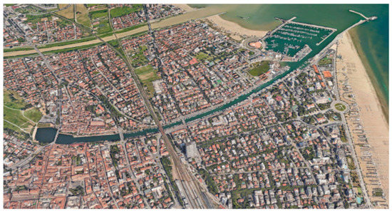The proposed case study for the urban redevelopment of degraded areas is the Canal Port of Rimini (Figure 3), a maritime city in northern Italy along the Adriatic coast. The Canal Port consists of the original mouth of the river Marecchia and connects the historic centre of the city and the promenade with the district of San Giuliano a Mare. Rimini is a tourist centre of international importance, mainly based on the beach and the sea. Tourism is also due to the offer linked to fairs and conferences, events, and the hotel industry. Although the Canal Port is close to the historic centre and is the only link between two important parts of the city, it is still in a state of decay and impoverishment.