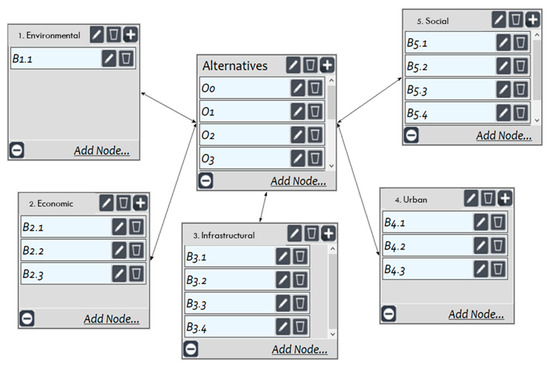 Once all nodes in the network have been classified within their respective clusters and the four sub-networks, it is possible to proceed with the BOCR analysis. The Superdecisions software (http://www.superdecisions.com/ accessed on 11 February 2022) was used as a tool to support the analysis. It is a proven tool that guides the development of the model and automatically generates the comparison matrices. The development of the model coincides with the assessment phase and has two levels: