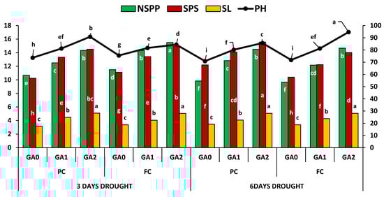 From our results, it is concluded that FC performance was maximum under GA2-6D for PH, CHB, CHA, SL, DSW, TSW, DRW, SW, OC, and NSPP. In the growing season, if drought stress prevailed for 6 days, its harmful effect was minimized by using GA3 at a dose of 150 mg L−1. The same trend was observed in PC; maximum performance was found for SW, OC, CARC, and SPS under 6D drought stress and foliar application of GA3 (G2) of 150 mg L−1.