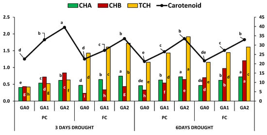 Under 6D stress and a foliar application of GA (150 mg L−1), an increase of CHB to 1.20 (FC) was observed, while a decrease was observed in FC (0.23) under 3D stress and GA at a dose of 0 mg L−1 (Figure 4). TCH was found to be at maximum in PC (1.92) under the treatment of 6D stress and GA application at a dose of 150 mg L−1, while the minimum value was found in PC (0.42) under 3D with no GA application (Figure 4). The ability of the basis to produce photosynthesis depends on the concentration of chlorophyll []. A preventing factor of photosynthesis is a low level of chlorophyll. The chlorophyll content remained very low in the plants under drought-stress conditions owing to the formation of ROS (relative oxygen species), which disturbs the chloroplasts []. Consequently, a significant plant output comes from a greater content of chlorophyll []. The key to regulating photosynthesis in plants grown under drought-stress conditions has been observed to be the foliar application of GA [,]. In this study, the foliar application of GA increased photosynthetic pigments CHA, CHB, THC, and CARC. Habibi [] observed the same impact of drought on chlorophyll content and carotenoid content.
