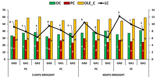 The OC was found to be at maximum in FC (40.93) at 6D stress and GA application at 150 mg L−1, while at 3D stress with no application of GA, OC was 32.13 in FC (Figure 5). OLEC was increased with increasing doses of GA (Figure 5). OLEC was at maximum in PC (60.20) at 3D stress and G2 treatment. However, in the control plant, 6D stress level showed a minimum OLEC in PC (52.53). Oil is the greatest entity for commercial purposes. The formation and content of oil are disturbed by external or environmental aspects []. Champolivier and Merrien [] revealed that a deficiency of water caused a 12% reduction in oil content during the development of siliques in the flowering stage. In almost all oil seed crops, the same process of lowering oil content due to a deficiency of water is also noticed in current complete research []. Reduction in OC due to a water shortage was also observed by Dwivedi et al. []. In the current investigation, drought stress reduced oil content, but the foliar application of GA recovered it. A great response to the foliar application of GA was shown by OC under drought conditions.