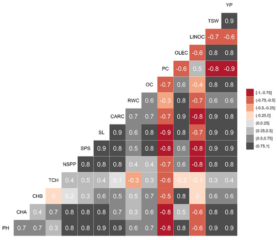 As shown in Figure 6, a highly significant correlation was observed between YP and SL (1.0 **); SPS (0.9 **); NSPP (0.9 **); TSW (1.0 **); PH (0.9 **); OLEC (0.8 **); OC (0.8 **); RWC (0.7 **); CARC (0.9 **); CHA (0.9 **); and significant correlation of CHB (0.6 *). TSW was significantly correlated with NSPP (0.9 **); PH (0.9 **); CHA (0.9 **); CARC (0.8 **); OLEC (0.6 *); and OC, TCH, and PC (0.5 *). OC content was significantly correlated with OLEC (0.6 *); PH (0.7 *); TSW (0.8 **); and SPS, SL, and YP (0.8 **). An increase in TSW was the goal of every research because TSW was a major yield-contributing trait. In our study, TSW was positively correlated with SL, PH, Caro, OC, TPW, SWP, SPS, NSPP, OlecC, and chlorophyll content [,,].
