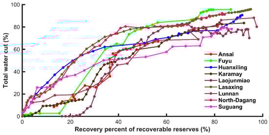 According to statistical analysis of the Information Energy Agency (IEA), up until 2050, global primary energy will still be in high demand, and the leading status of oil and natural gas will not fundamentally change. As new, easily recoverable oil and gas reserves are becoming scarce, the vast majority of global oil and gas production is sourced from tapping the potential of old oil and gas fields or the development of complex unconventional oil and gas fields. However, traditional reservoir engineering methods have encountered challenges in many aspects of reservoir analysis. For example, processing, cleaning, and analyzing raw field data can be laborious and computationally intensive. In most cases, reservoir engineers must follow a trial-and-error protocol to translate seismic survey data, well logs, core analysis, production history, and other data into a more practical engineering format []. With the development of artificial intelligence and big data, the application of artificial intelligence has allowed the development of traditional oil and gas fields to gradually enter the era of intelligent, digital oil and gas fields, which greatly improves the intelligence degree of these fields, not only helping to reduce the cost of oil and gas field development, but also improving the quality and efficiency. Big data and artificial intelligence will certainly be more widely used in the development of oil and gas fields. In terms of tapping the potential of mature oilfields, as development progresses, many oilfields in China are in the “double high period” of high recovery degree and high water cut (the average water content is 87.7% and the average recovery percentage of recoverable reserves is 74.7%), and major oilfields such as Daqing and Shengli are even in the ultra-high water cut period, as shown in Figure 1. Optimization production in mature fields is a complex problem that is difficult to solve with current subsurface modeling solutions. On the one hand, the traditional 3D numerical reservoir solver has high fidelity for the physical of multiphase porous media flows and has the advantage of long-term prediction accuracy. However, complex and time-consuming workflows mean that models and predictions are immediately out of date. In addition, the computational cost of simulation means that it is virtually impossible to run thousands of scenarios to quantify the uncertainty []. The main challenges include: (i) the highly dispersed distribution of the remaining oil; (ii) the complex relationship between oil and water; and (iii) the difficulty of stabilizing oil production and controlling water []. In terms of development and production, on the one hand, the development of long well sections leads to large differences in production between vertical layers; on the other hand, the casings of old wells are seriously damaged and deformed, making it difficult to form a complete injection–production pattern on the plane []. In addition, due to the high heterogeneity of oilfields, after long-term water injection and flushing, a preferential seepage channel forms, which results in ineffective injection of water and inefficient circulation. As a result, these effects restrict oilfield development and further increase the difficulty of exploiting recoverable reserves. There are many methods to improve the production of oilfields by evaluating and optimizing the water injection efficiency, such as using the CRM (capacitance resistance model) to characterize the dynamic connectivity of the injection and production wells and analyze the influence of injection and production imbalance on oil production, changing the flow direction of oil, subdividing the injection and production unit, and carrying out water shut-off to improve the areal sweeping efficiency [,,,]. For more complex injection–production relationships, with frequent changes in displacement performance and ineffective water circulation, it is of great significance to carry out fine-detail and intelligent reservoir analysis to improve the development efficiency and oil recovery of mature oilfields. Considering that current mature oilfields in the high water-cut period urgently require new technology to promote layer water injection performance, the fourth-generation separated-layer water injection technology has been developed for mature oilfields. The core of this technology is to monitor and adjust parameters automatically in the whole separated–layered injection process [].