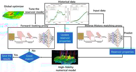 On the other hand, in addition to managing the massive data generated with respect to geophysics, geology, reservoir, and engineering throughout the whole process of petroleum exploration and development, the layered dynamic monitoring data of single wells and reservoirs, generated using new measurement methods and sensing equipment, has become an extremely important supplement to big reservoir data. Different from geophysical interpretation data, this type of observational data is more direct and reliable, and can be collected more frequently and intensively, supplementing data for comprehensively sensing the dynamics of subsurface pressure and fluid distribution. AI technology combines this massive engineering production history data to dynamically adjust reservoir properties. First of all, the production history data is passed through the inverse history matching model to preliminarily predict the reservoir physical properties. The reservoir properties predicted by the high-fidelity numerical model were used to test the matching quality. If a good match is obtained, the result is saved. Otherwise, prospective data will be used to further adjust reservoir properties. In this case, a global optimization algorithm can be combined with an intelligent system to minimize historical matching errors. Figure 3 illustrates an AI-assisted history-matching workflow for reservoir properties.