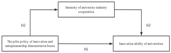 In this section, we (1) analyze how the pilot policy of the IEDB affects UIC, and (2) review the literature on the impact of UIC intensity on IAU. UIC refers to the cooperation between universities, scientific research institutions, and enterprises. It is an effective organizational form commonly used by countries to realize the complementary advantages of R&D resources of enterprises and universities, and to enhance the economic and social benefits of enterprises, regions, or countries. Initiating university–industry collaboration often requires government support [30,31]. The pilot policy of the IEDB may lead to further decentralization and simplification of the government, greatly enhancing the enthusiasm of subjects involved in the innovation and entrepreneurship initiatives in the regional demonstration zones [5]. Specifically, the corresponding government usually provides enterprises with special financial support for innovation development. It can help to enhance the overall innovation and entrepreneurship level of the region, eliminate the negative externality of financing constraints on enterprise innovation, and promote the innovation activities of enterprises [32]. In this context, universities, as the main actors of scientific and technological innovation-achievements, are important partners of enterprises in innovation [33]. Therefore, along with the pilot policy of the IEDB, UIC has become key for enterprises to implement innovative activities [34,35]. In addition, once universities become the pilot location for IEDB, the transformation of their scientific and technological innovation and achievement will receive significant attention and support from local governments, attracting enterprises to seek innovation cooperation [32,36]. In other words, the construction of IEDB may have a positive impact on the UIC intensity.