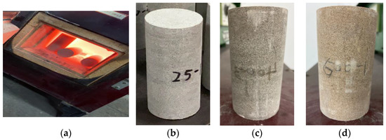 Before the test, each specimen was marked and then divided into groups which were then heated at the temperature gradient of 25 °C, 200 °C, 400 °C, 600 °C, 800 °C, and 1000 °C. Each group included three specimens and each group was heated at a certain temperature in electric heating furnace for 3 h. Then, the heating furnace was turned off and natural cooling was performed in furnace. After the heating treatment was completed, the specimens were taken out and stored in sealed bags to avoid influences of moisture in the air. The heating process and the specimens after high temperature treatment are shown in Figure 1. As can been seen in Figure 1, the appearance of the specimens changed from green to yellow under the action of high temperature from 25 °C to 500 °C.