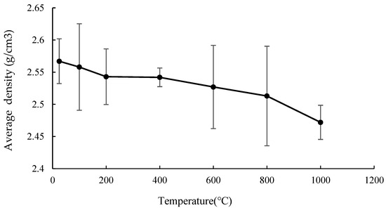 After high temperature heating treatment, the physical parameters of specimens, including height, diameter, and mass of the specimens, were measured, with the results recorded in groups (Table 2). The relationships between the average density of specimens with heating temperature are shown in Figure 4. The average densities of specimens decreased with the increases of heating temperature, and the mass of specimens was continuously lost under the action of high temperature. The density change of specimen was different in each temperature interval. The density decreased obviously after 25 °C and 200 °C, which may be due to the evaporation of water inside the specimen. After the heating temperature of 200 °C and 400 °C, the density of the specimen basically remained unchanged. At the heating temperature between 400 °C and 1000 °C, the average density showed an obvious decreasing trend again. The decreasing rate of density at the temperature of 800 °C and 1000 °C was obviously higher than that in the range of 400–800 °C. The average density of specimens after heating at 1000 °C was 96.2% of the average density at normal temperature. The maximum density loss after heat treatment reached around 4%, which indicated the significant influence of temperature on the density of the rock materials.