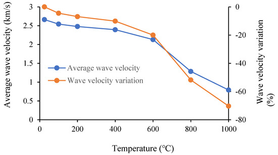 Based on Equation (5), the longitudinal wave velocity and average damage variations of specimens after high temperature treatment were obtained, with the results shown in Table 3. The variation trend of the average wave velocity and reduction rates are shown in Figure 5, which clearly reflected the relationship between wave velocity variation and temperature. The longitudinal wave velocity of the specimen showed a downward trend with the increase of heating temperature. At the heating temperature between 25 °C and 600 °C, the longitudinal wave velocity decreased slowly. When the temperature was higher than 600 °C, the longitudinal wave velocity decreasing rates were relatively higher. At the temperature between 800 °C and 1000 °C, the decreasing rate of longitudinal wave velocity was again slower than that between 600 °C and 800 °C, but the overall decreasing rate was still higher than that between 25 °C and 600 °C. At the heating temperature of 1000 °C, the average wave velocity of the specimens was only 29.7% of that at normal temperature, which indicated the significant influence of temperature on the physical properties of specimens.