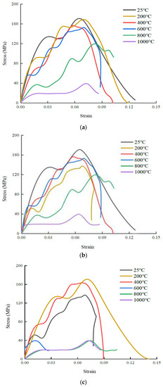 For SHPB tests, three different air pressure impacts were set for the specimens heated at various temperature conditions. The impact air pressure impacts were set to 0.3 MPa, 0.4 MPa and 0.6 MPa, respectively. The stress-strain curves of the specimens under different impact pressures after different temperature treatments are shown in Figure 7. Generally, as can be seen in all figures when the stress reached the maximum, the slope of the stress-strain curve was approximately a straight-line segment, which indicated the stress showed an approximate linear relationship with the strain. This stage could be regarded as the elastic stage. Once the maximum stress reached, the stress decreased sharply with the increase of strain. At this stage, the generation of new cracks and the continuous evolution of original cracks leaded to the failure of the specimens. In Figure 7a,b, it can be observed that under the air pressure impacts of 0.3 MPa and 0.4 MPa, the peak stress of the specimens at normal temperature was the highest among all temperatures. While under the air pressure impacts of 0.6 MPa, the peak stress of the specimens heated at 200 °C was the highest among all temperatures. On the whole, the trend of the peak stress of specimens with temperature showed a certain regularity. Under the impact of all different impact pressures, the peak stress of the specimens after the treatment of 1000 °C was the smallest. This was because after the specimens heated at 1000 °C, the internal cracks increase, resulting in great damage and destruction of the specimens. The internal damage of the specimens led to the rapid reduction of cohesion and significant deterioration of the mechanical properties of the specimens.