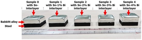 The liquid–solid casting method was used to create Babbitt–steel bimetallic specimens. Table 1 displays the chemical compositions of the as-received Babbitt alloy (Rotometals, San Leandro, Ca 94577 USA) and steel substrate. Solid substrates made of low-carbon steel with dimensions of 35 × 35 × 8 mm were cut and one substrate surface of 35 × 35 mm was ground using emery papers with grades of up to 1200. Pure Sn with a purity of 99.7% and pure Bi with a purity of 99.5% (Alpha Aeser, Tewksbury, UK) were used to prepare the tinning Sn–Bi alloys interlayer with a different Bi content. In the experiment, 100 g of Sn and Bi were weighted in accordance with the required weight percentage of 1, 2, 3, and 4 of Bi in the Sn–Bi alloy for Sn–Bi powdered interlayer alloys.