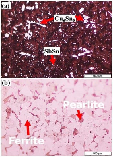 As shown in Figure 2, the microstructures of (a) re-melted Babbitt (Babbitt zone of bimetal composite) after pouring on steel substrate and (b) as-received steel solid substrate were observed. It was observed that the precipitates SbSn and Cu6Sn5 in a matrix of Sn–Sb–Cu were clearly defined. It was reported [,,] that the chemical composition constituent variation of Babbitt alloy significantly changes the resulting solidification microstructure precipitates. Babbitt contains less than 8 percent Sb, fine precipitates of SbSn and needles/circular shapes of Cu6Sn5 in a Sn–Sb–Cu matrix are observed. The solid carbon steel microstructure is shown in Figure 2b, which reveals ferrite and pearlite phases. The relatively higher percentage of ferrite (white phase) and lower percentage pearlite (black phase) confirms the lower percentage C contents in the steel (0.12).