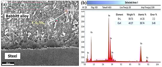 (a) SEM Micrograph of Babbitt–steel composite microstructure, (b) EDS spectrum of selected area in (a).